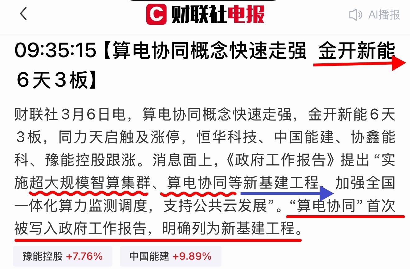 《政府工作报告》首提、其中关键词:“算电协同”、大规模“智算”。