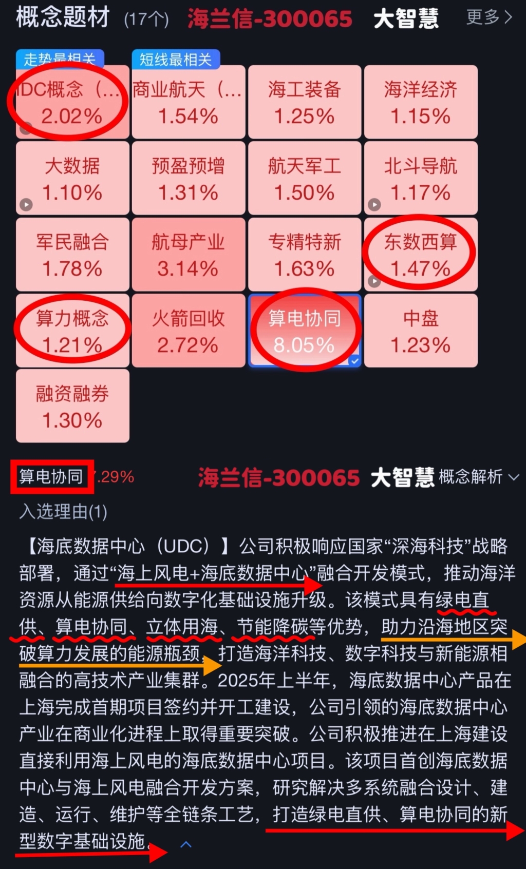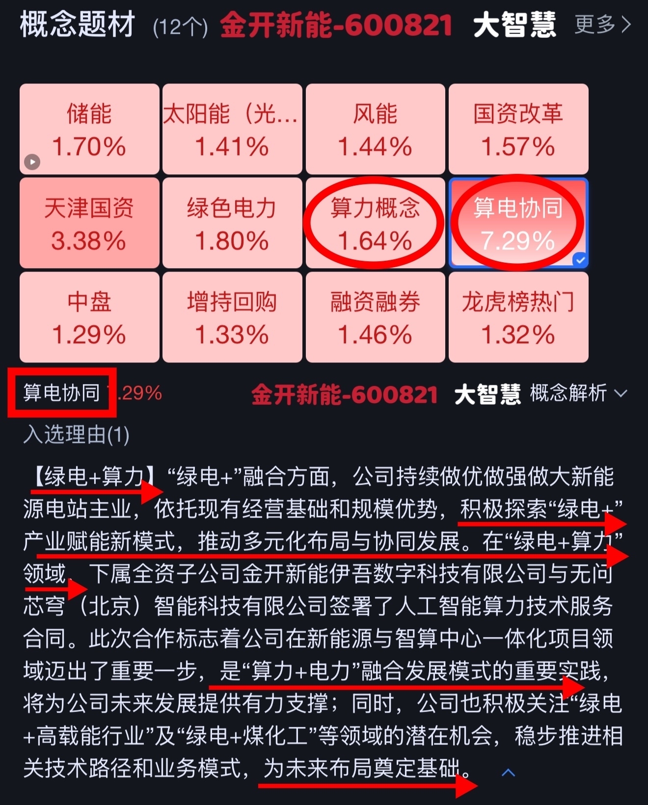 龙头-金开新能、中军-中国能建、次新-南网数字、龙二-协鑫能科、龙三-韶能股份、补涨龙-海兰信;首批入选大智慧“算电协同”板块仅有龙头、中军、补涨龙海兰信。