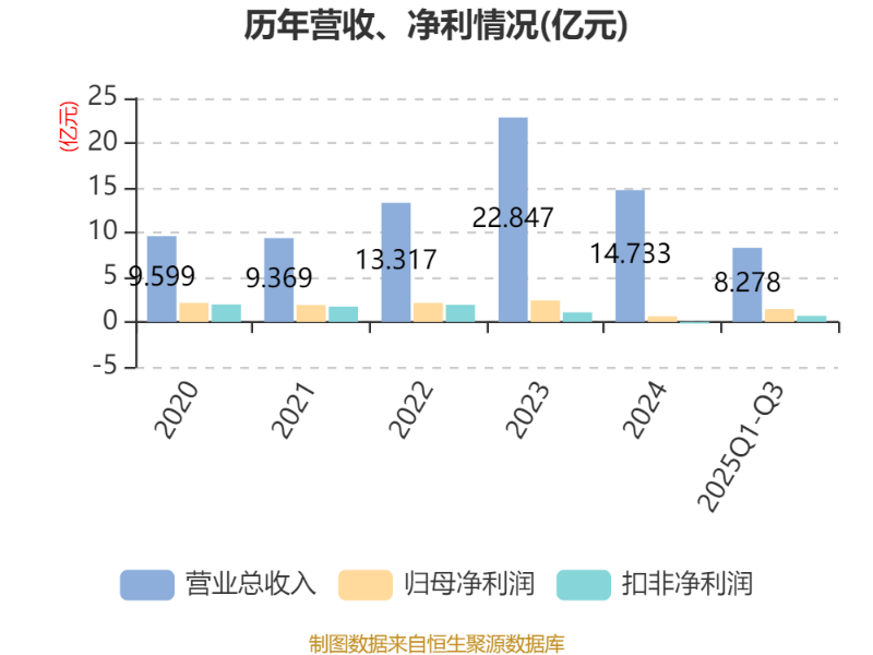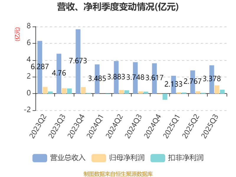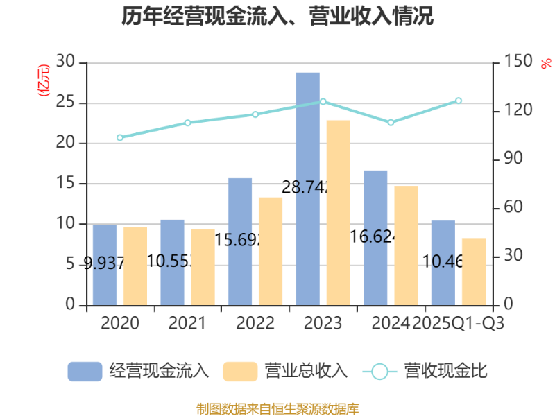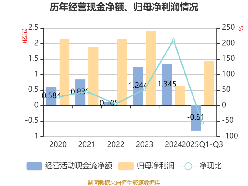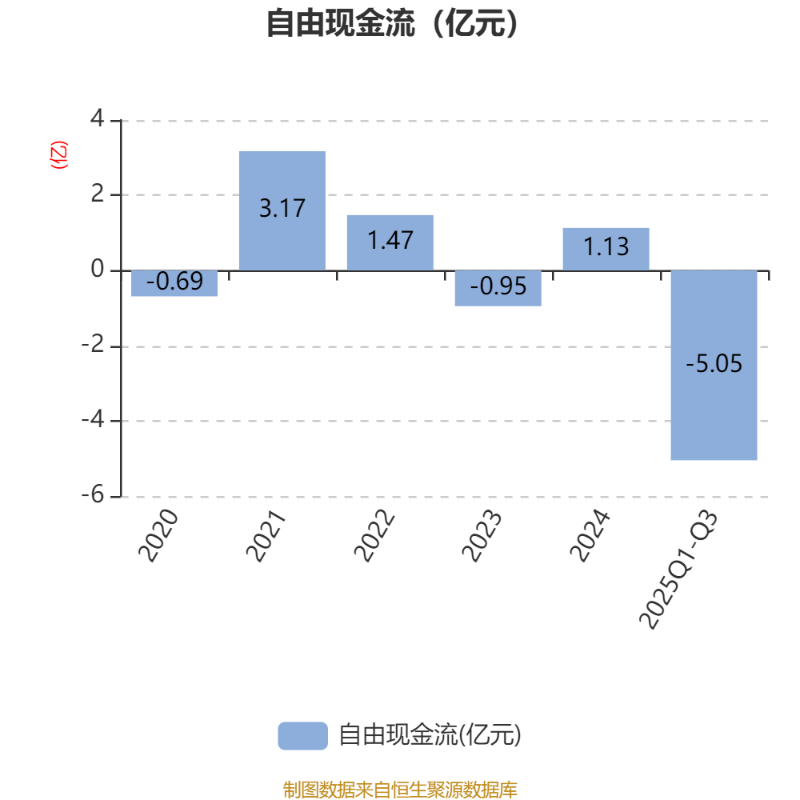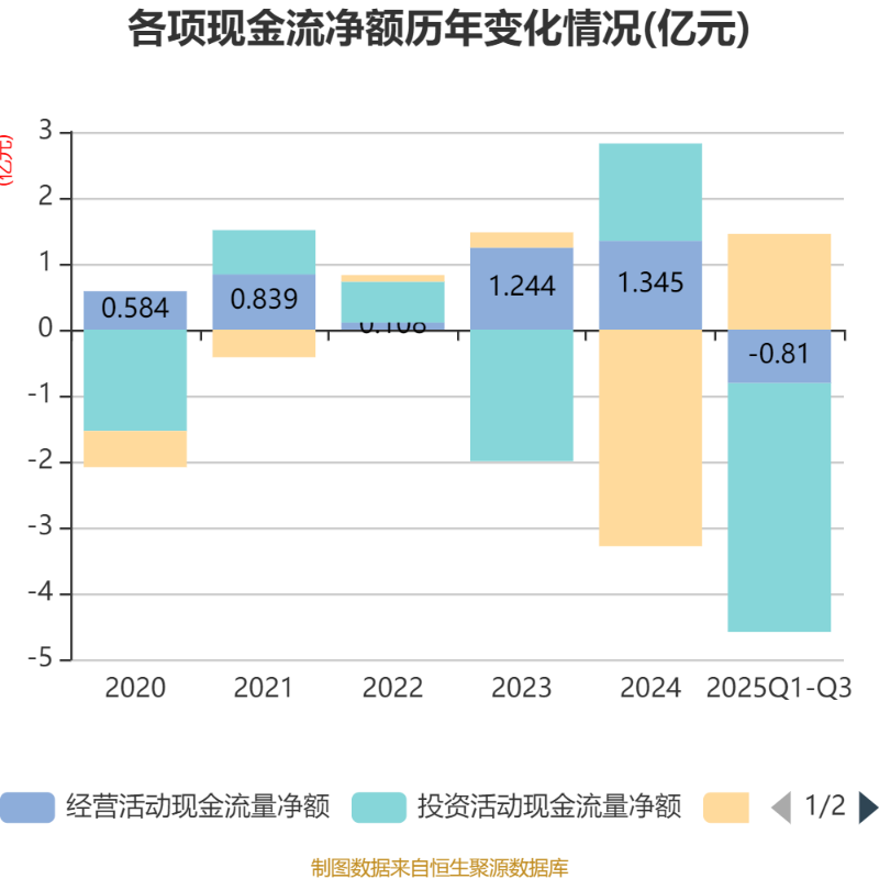 2025年前三季度,公司经营活动现金流净额为-8099.42万元,同比减少8172.15万元;筹资活动现金流净额1.45亿元,同比增加2.81亿元;投资活动现金流净额-3.78亿元,上年同期为-2.22亿元。