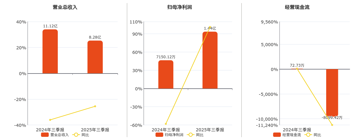公司营业总收入为8.28亿元,较去年同报告期营业总收入减少2.84亿元,同比较去年同期下降25.53%。归母净利润为1.44亿元。经营活动现金净流入为-8099.42万元,较去年同报告期经营活动现金净流入减少8172.15万元,同比较去年同期下降1.12万%。