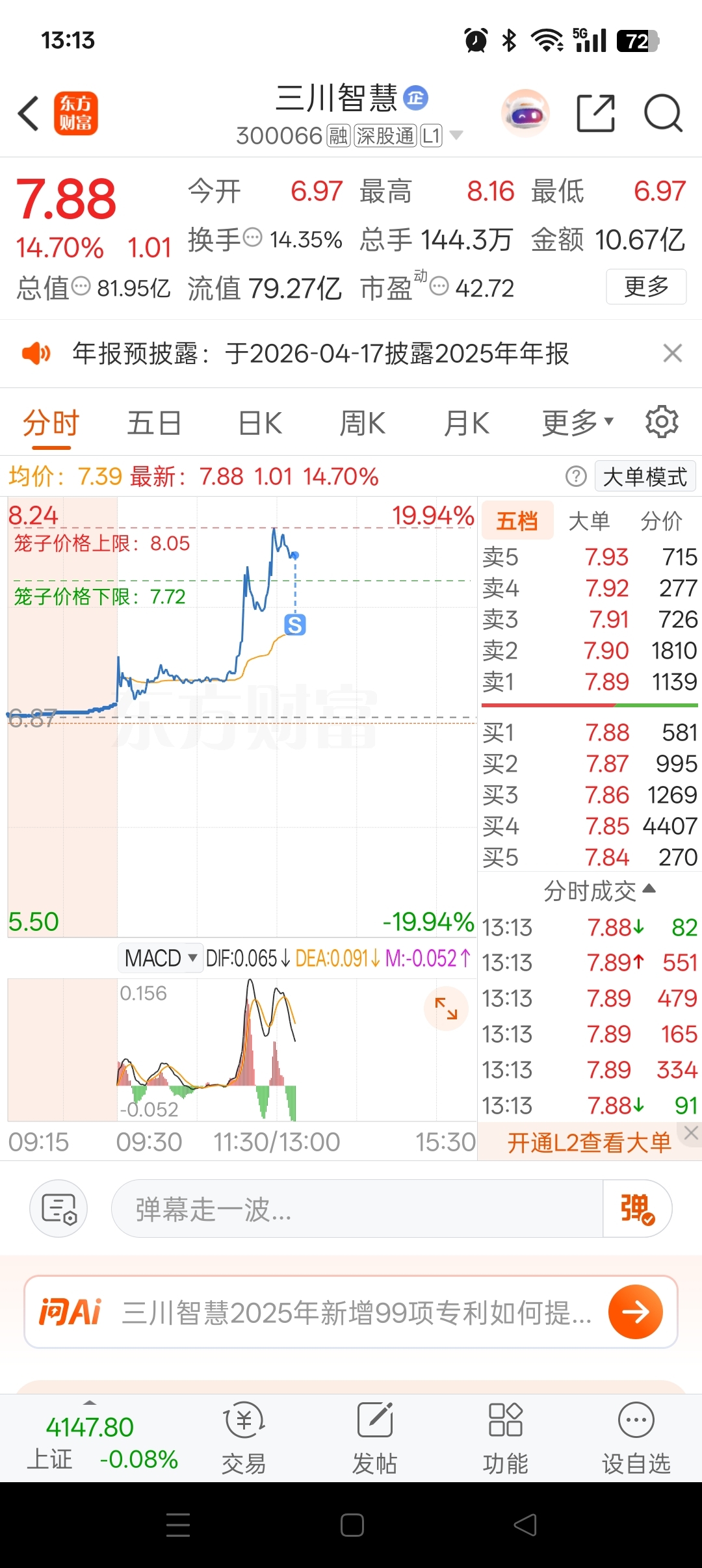 $三川智慧(SZ300066)$ 百分之16走了