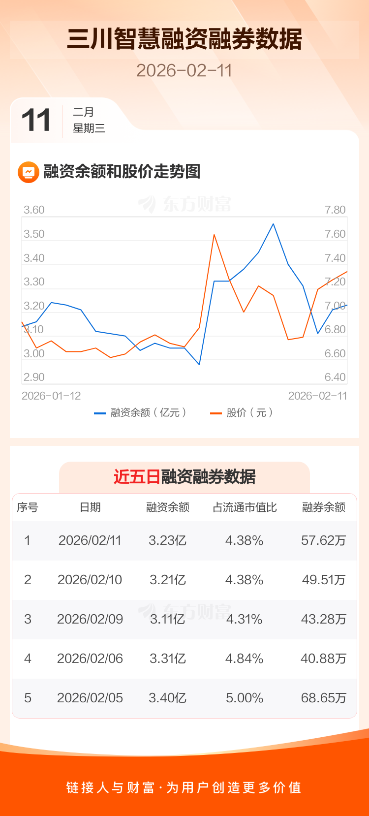 交易所最新数据显示,三川智慧于2026年2月11日获融资买入4921.36万元,融资偿还4656.45万元,当日融资净买入264.9万元。目前,该股融资余额3.23亿,占流通市值比例为4.38%。