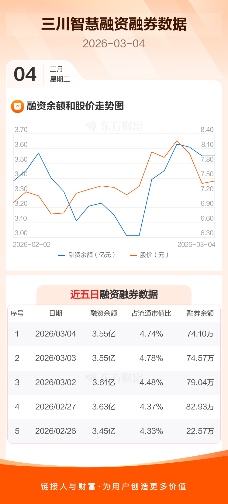 交易所最新数据显示,三川智慧于2026年3月4日获融资买入3479.91万元,融资偿还3528.93万元,当日融资净偿还49.02万元。目前,该股融资余额3.55亿,占流通市值比例为4.74%。