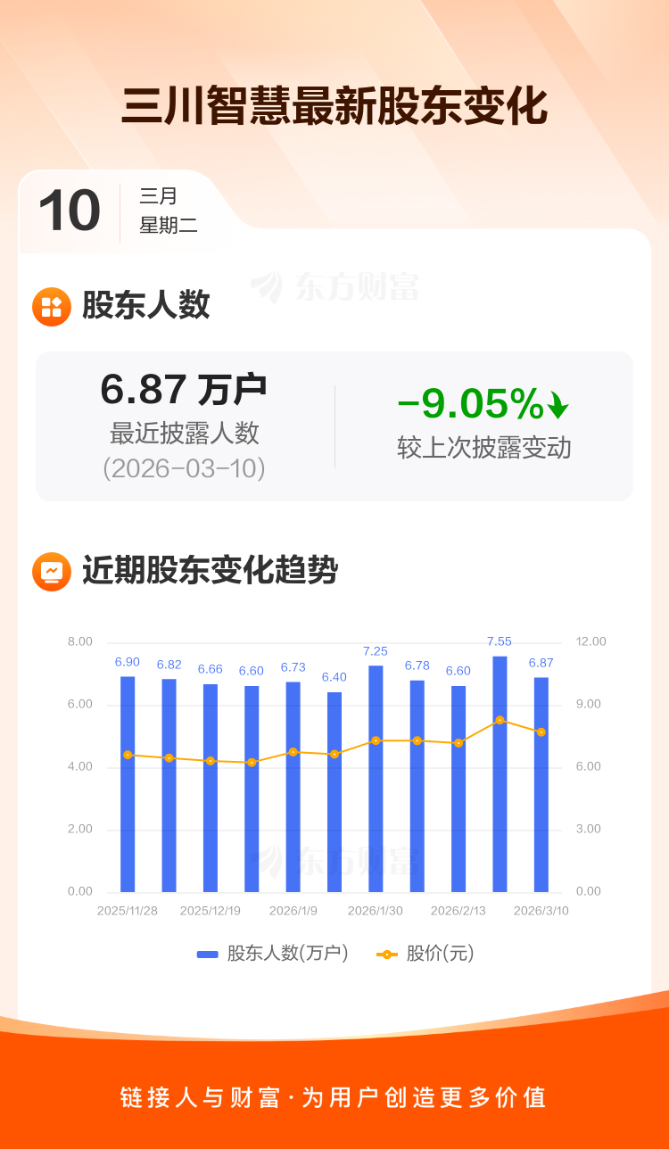 三川智慧:截至3月10日最新股东户数6.87万户,较上期减少9.05%