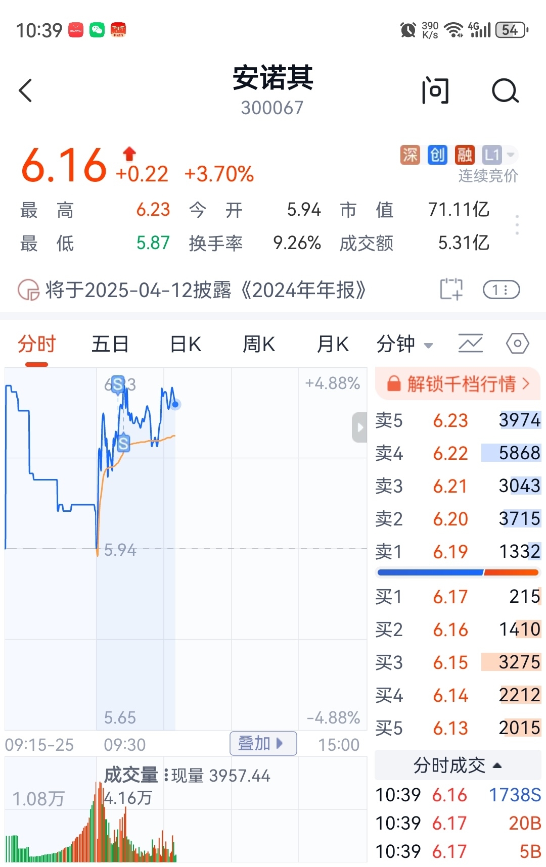 $安诺其(SZ300067)$ 上涨乏力,冲高分批出清。待尾盘再看,若能站上6则可再进玩玩,若还是不能站上6(三次不上),则暂时放一放。现在不操作,只喝茶!