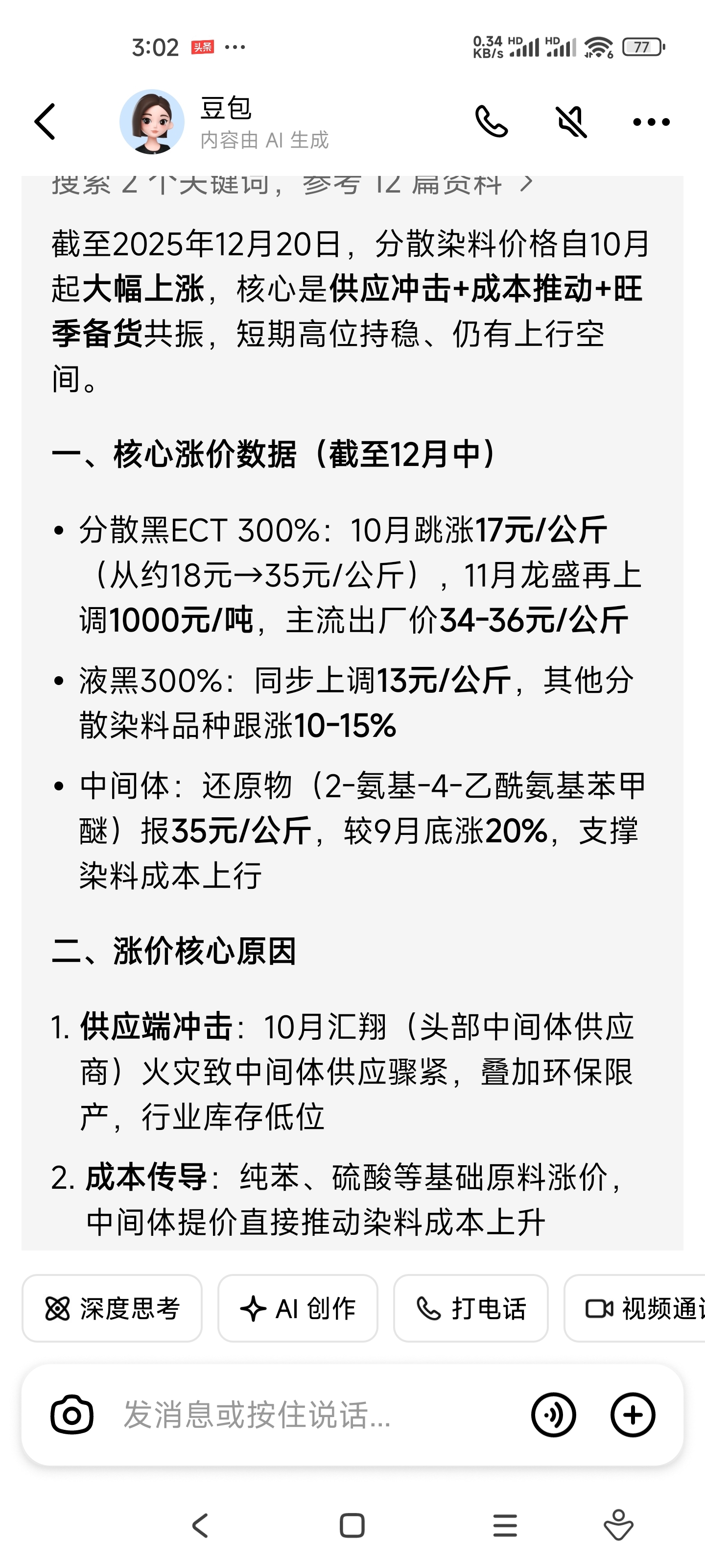 $安诺其(SZ300067)$ 截至2025年12月20日,分散染料价格自10月起大幅上涨,核心是供应冲击+成本推动+旺季备货共振,短期高位持稳、仍有上行空间。