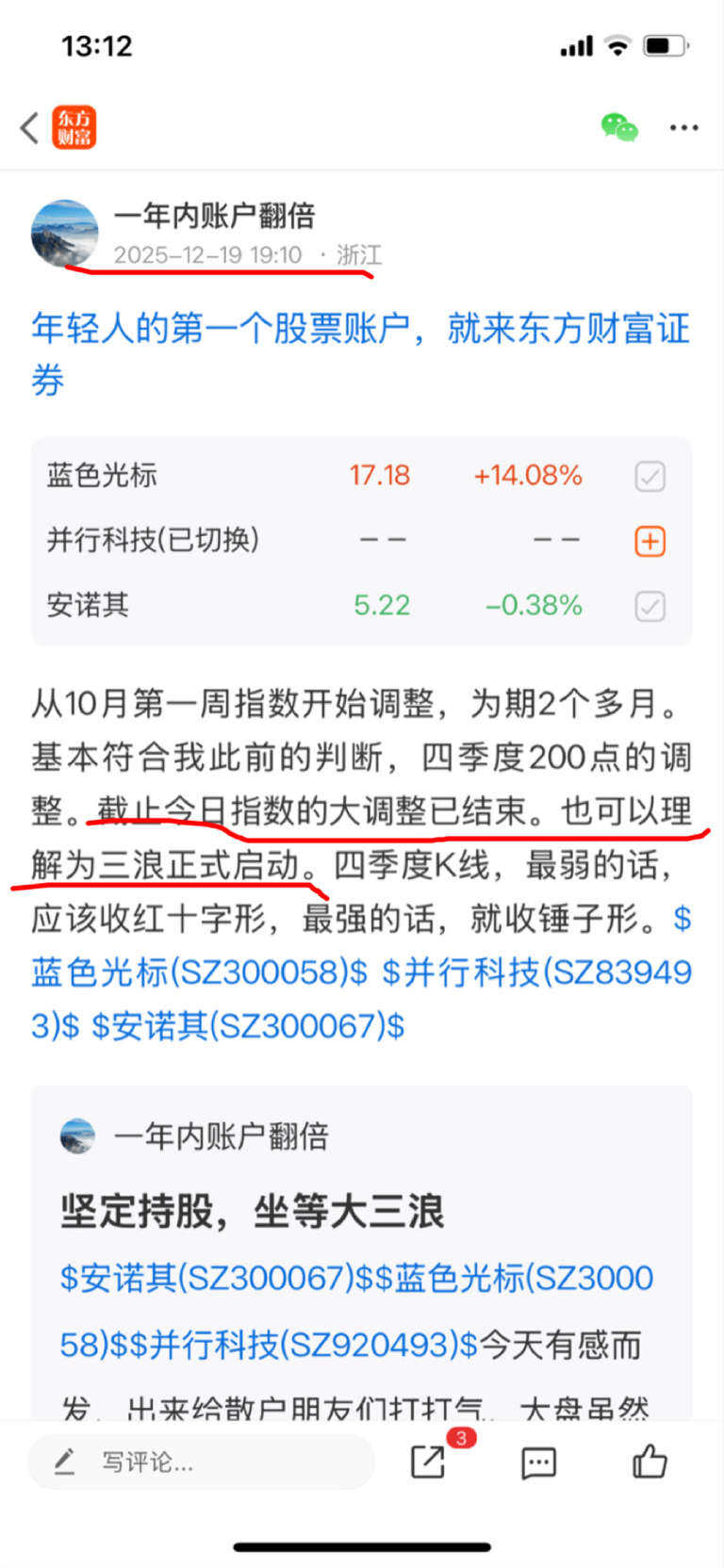 $蓝色光标(SZ300058)$ $并行科技(SZ920493)$ $安诺其(SZ300067)$ 12月19日,我说的三浪已启动,目前看来基本准确,接下来就让时间来验证吧。