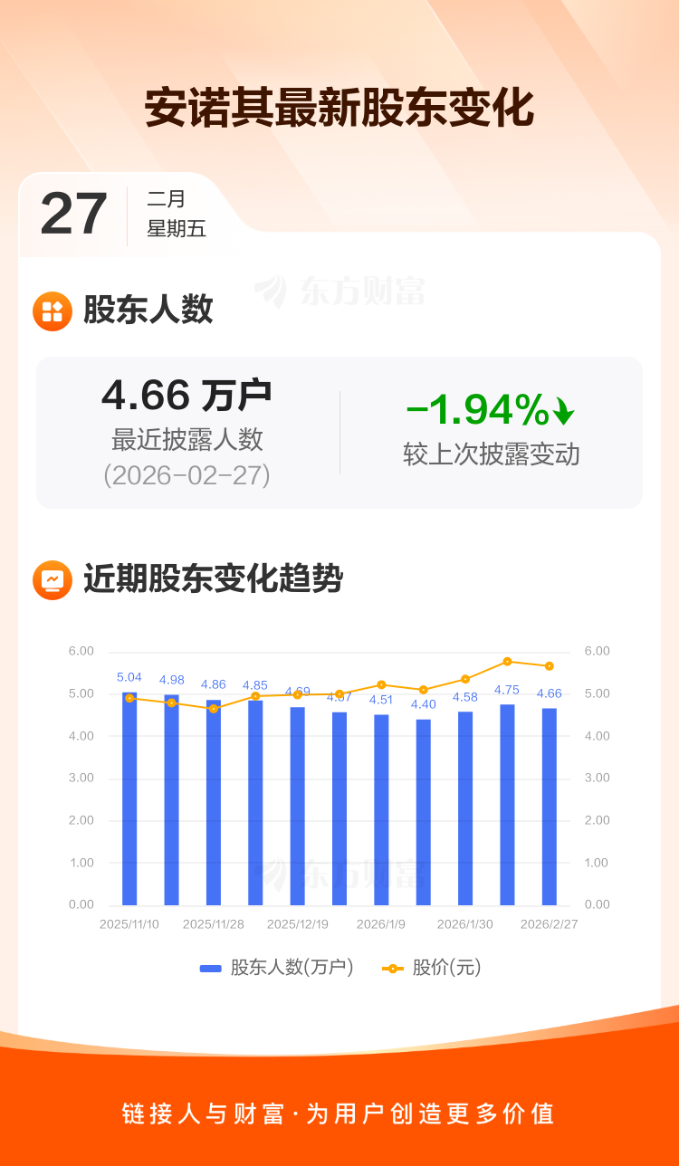 安诺其:截至2月27日最新股东户数4.66万户,较上期减少1.94%