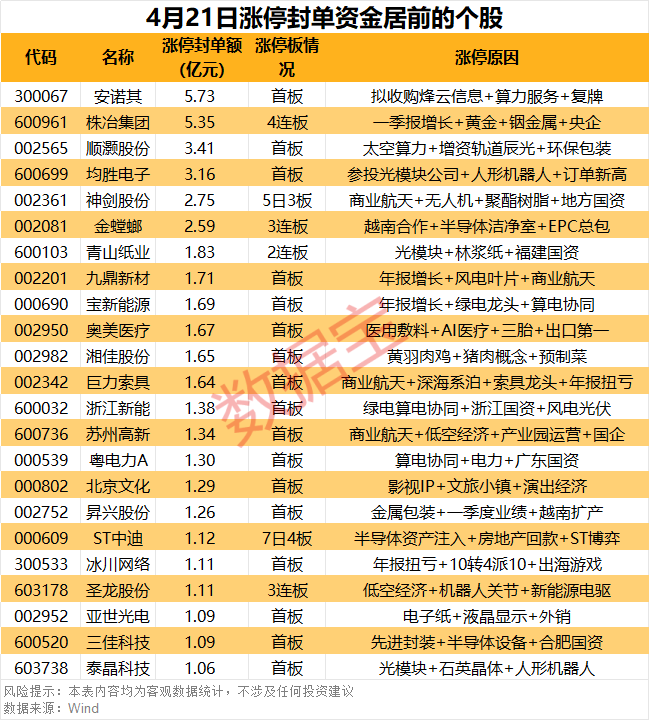 封死涨停股中,ST中迪、*ST宇顺等12股为ST股。从连续涨停天数看,株冶集团已连收4个涨停板,连续涨停板数量最多。