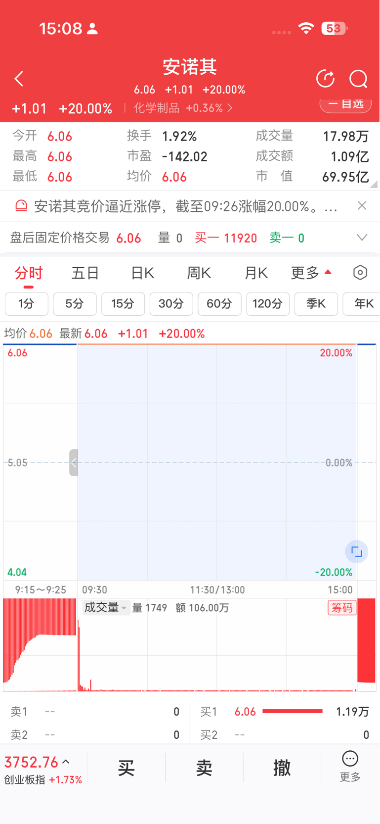 $安诺其(SZ300067)$ 尾盘秒变1.19万手?啥情况?
