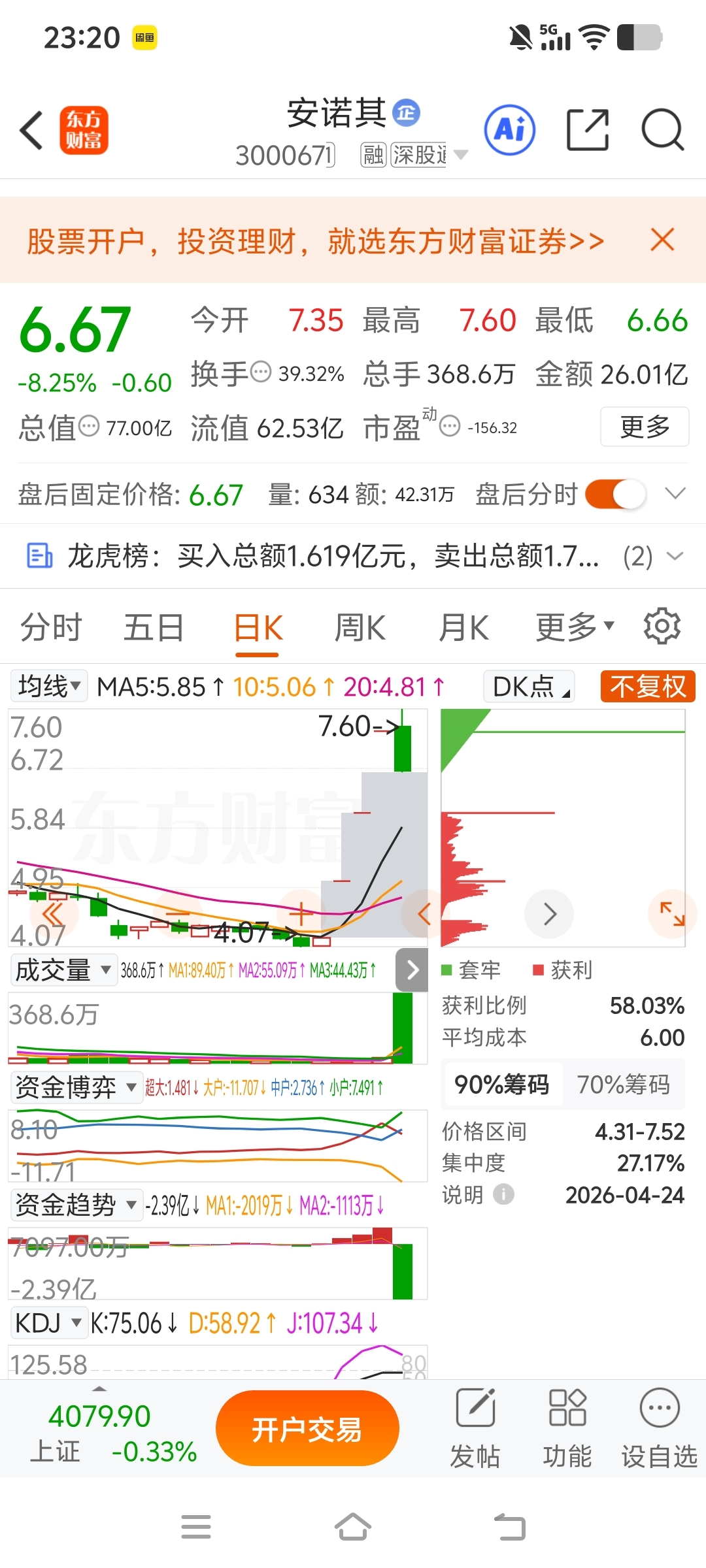 $安诺其(SZ300067)$ 周五换手太大,资金分歧,下周一盘中不能快速突破7.6,还是出来为好,反正大家都赚钱了,大约盈利都在40%左右,先出来看看,等企稳了在做决策是否进!