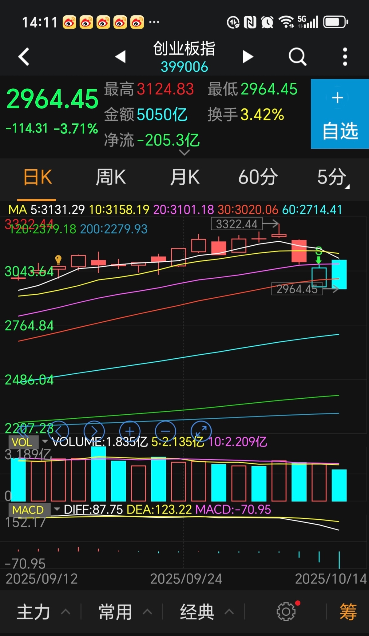 $南都电源(SZ300068)$ 创业板指数要大级别调整了