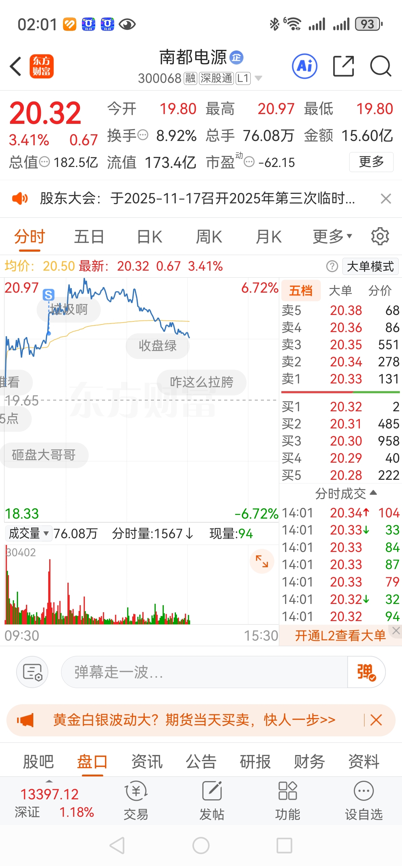 $南都电源(SZ300068)$ 以为卖飞了,没想到居然还可以,收盘不知道跌几个点。这种冲高回落的,明天低开跑不掉了,明天低开我再接回来吧