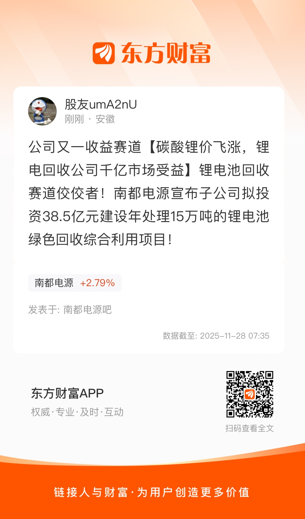 公司又一收益赛道【碳酸锂价飞涨,锂电回收公司千亿市场受益】锂电池回收赛道佼佼者!南都电源宣布子公司拟投资38.5亿元建设年处理15万吨的锂电池绿色回收综合利用项目!