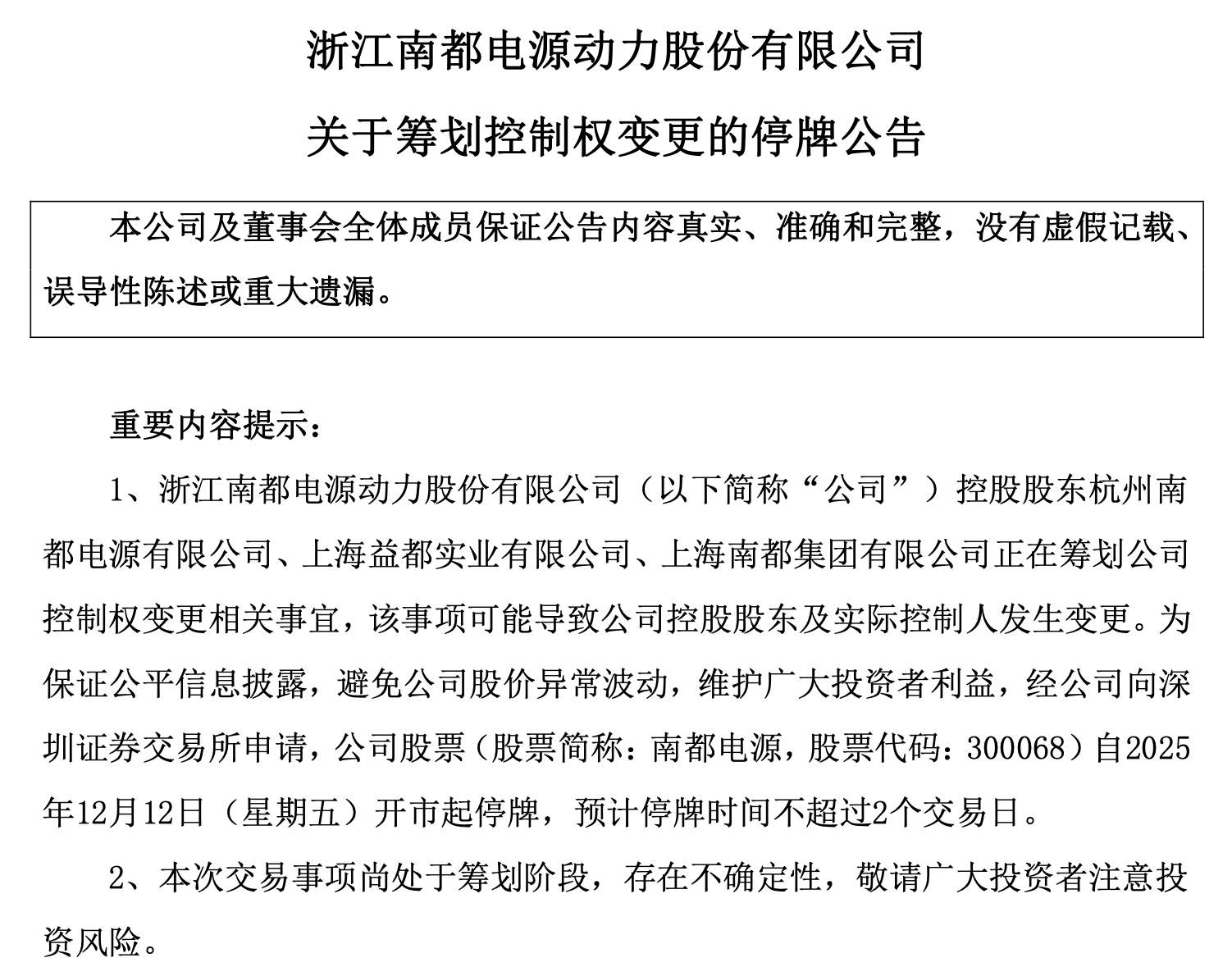 12月11日,南都电源(300068)公告,公司控股股东杭州南都电源有限公司、上海益都实业有限公司、上海南都集团有限公司正在筹划公司控制权变更相关事宜,该事项可能导致公司控股股东及实际控制人发生变更。