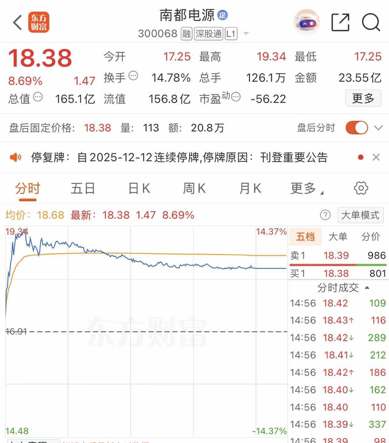 另外,公司股票(股票简称:南都电源,股票代码:300068)自12月12日(星期五)开市起停牌,预计停牌时间不超过2个交易日。