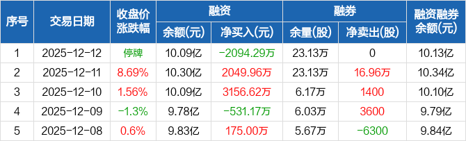 融资方面,当日融资买入0元,融资偿还2094.29万元,融资净偿还2094.29万元。融券方面,融券卖出0股,融券偿还0股,融券余量23.13万股,融券余额425.13万元。融资融券余额合计10.13亿元。