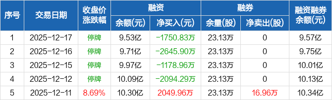 融资方面,当日融资买入0元,融资偿还1750.83万元,融资净偿还1750.83万元,连续4日净偿还累计7669.98万元。融券方面,融券卖出0股,融券偿还0股,融券余量23.13万股,融券余额425.13万元。融资融券余额合计9.57亿元。