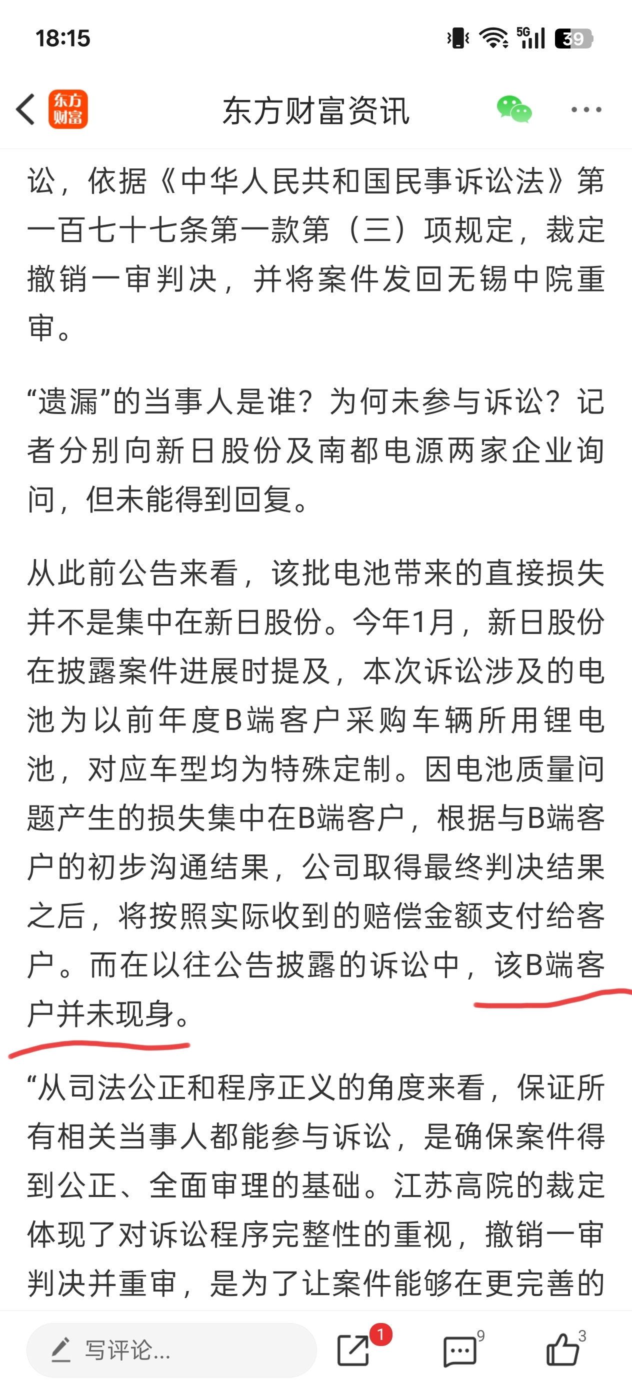 新日说这批电池是用在B客户出问题的。而上次打官司b客户一次也没出现过,也就是新日自己单方面在说对B客户造成损失。所以这就利好南都了。因为就算真有B客户南都大不了就是上次的判决。但是反转来了万一新日的B客户实际没有或者有猫腻呢?那就没有对B客户造成损失。