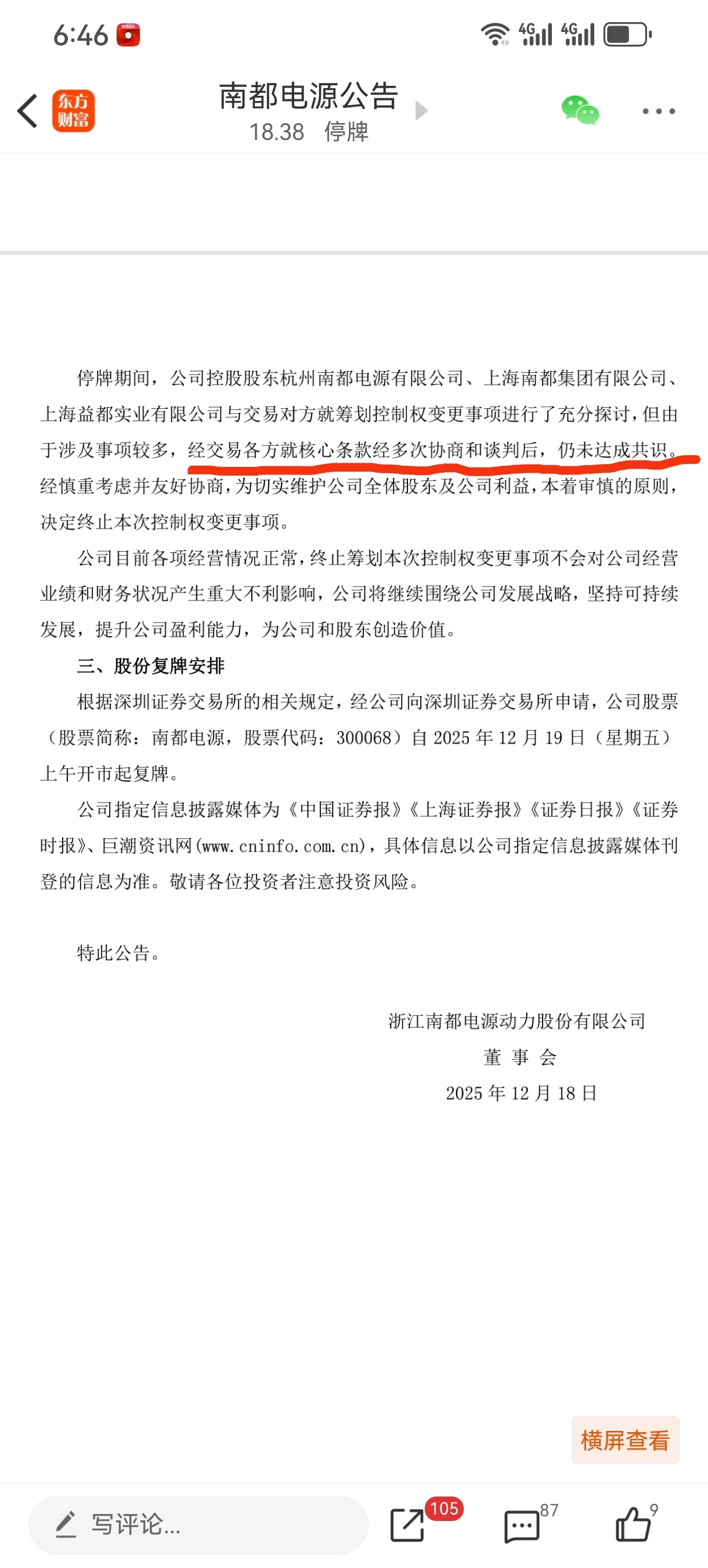 $南都电源(SZ300068)$ 长期利好,短线利空。出售再生铅的公告也没出来,也有可能是出售再生铅业务的价格没谈拢,从而影响股权的转让。另外公告说“各方”,那就不止双方谈判,有可能是三方在谈。不管如何,长线继续看多,差不多到炒年报的时间段了,去年亏损15亿左右。今年年报亏损1亿或者持平,业绩同比大涨。