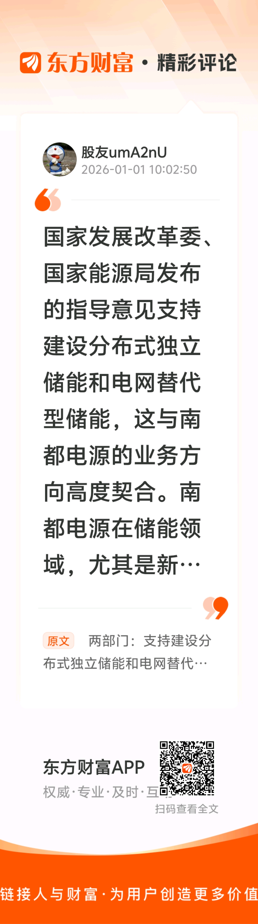 //@股友umA2nU :国家发展改革委、国家能源局发布的指导意见支持建设分布式独立储能和电网替代型储能,这与南都电源的业务方向高度契合。南都电源在储能领域,尤其是新型电力储能和通信与数据中心储能方面,拥有强大的技术实力和市场地位,其产品和解决方案已在全球范围内得到广泛应用。指导意见的出台有望进一步推动储能行业的发展,为南都电源带来更多的市场机遇。