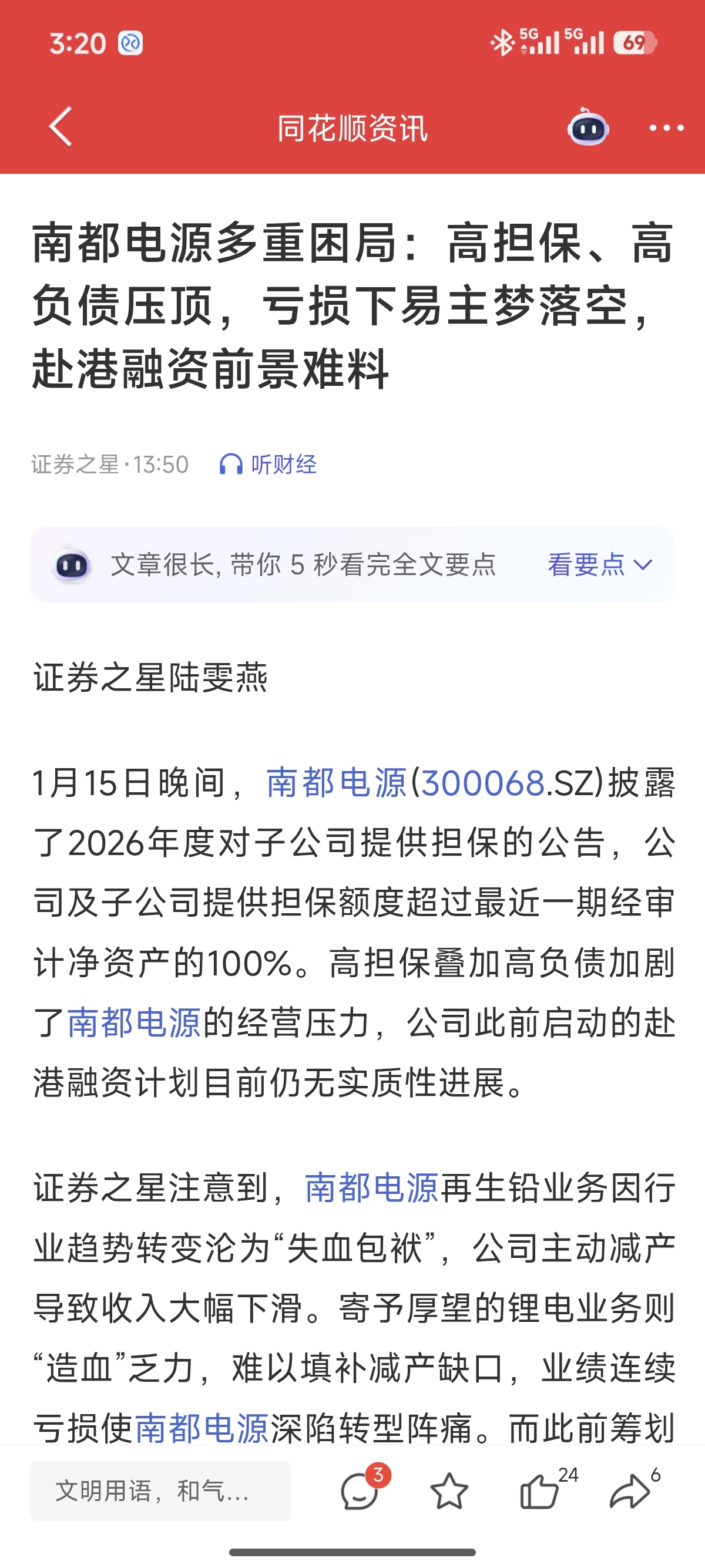 $南都电源(SZ300068)$ 为啥看到同花顺这个消息我居然感觉有点庆幸啊。感觉是不是洗的差不多了。明明是看空的文章。我为啥觉得是利好