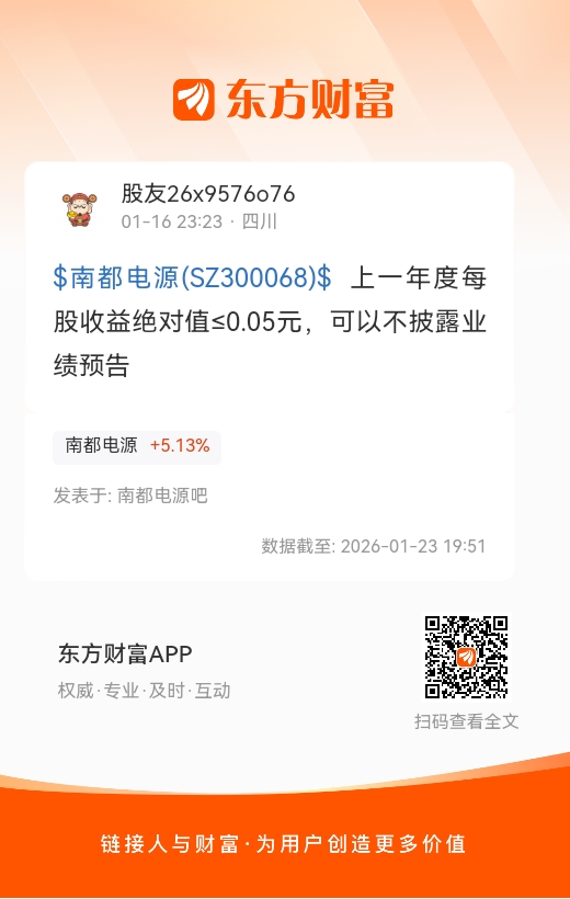 $南都电源(SZ300068)$  上一年度每股收益绝对值≤0.05元,可以不披露业绩预告