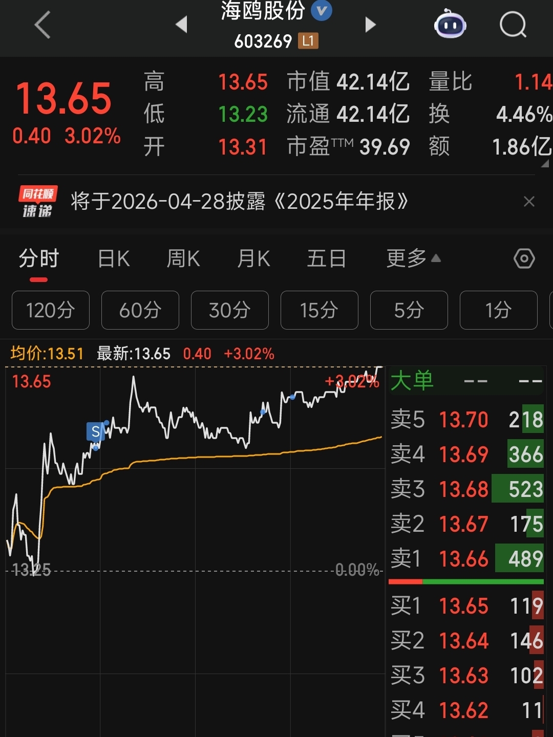 3、海鸥股份,周四晚上就说了,海鸥要开始选择方向了,而我是相信往上选择的(说马后炮的可以看周四晚上的帖子),目前走势非常好。但是受制于大盘风险,之前13.2附近及以下的仓位低吸了不少,周五冲高13.6附近还是陆续出了一部分仓位,底仓继续持股待涨。