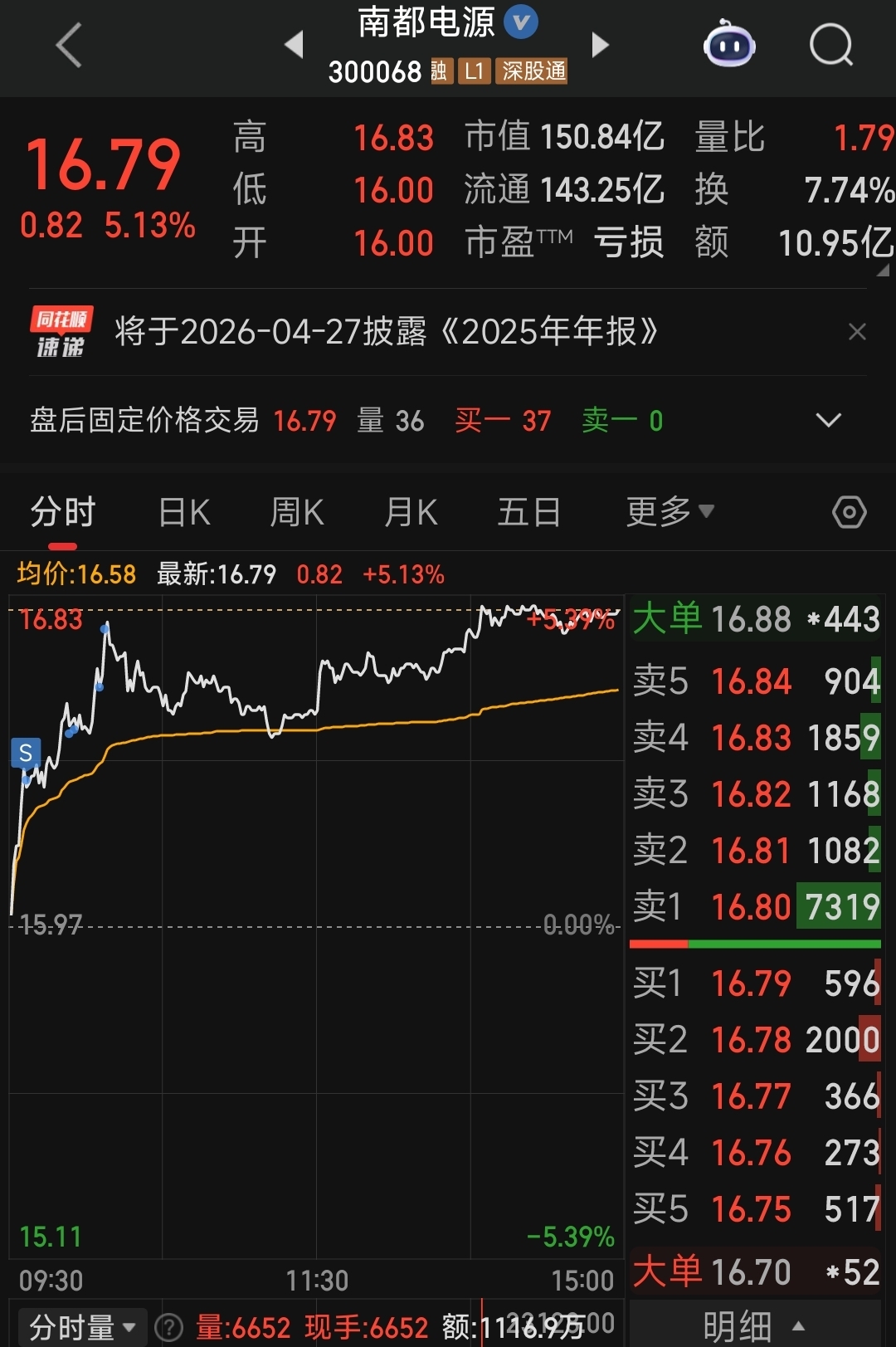 2、南都电源,今天也是再次按计划冲高减仓,把之前16附近低吸的不少仓位,在16.5以上陆续出掉,又是3个点的T。底仓继续持有。