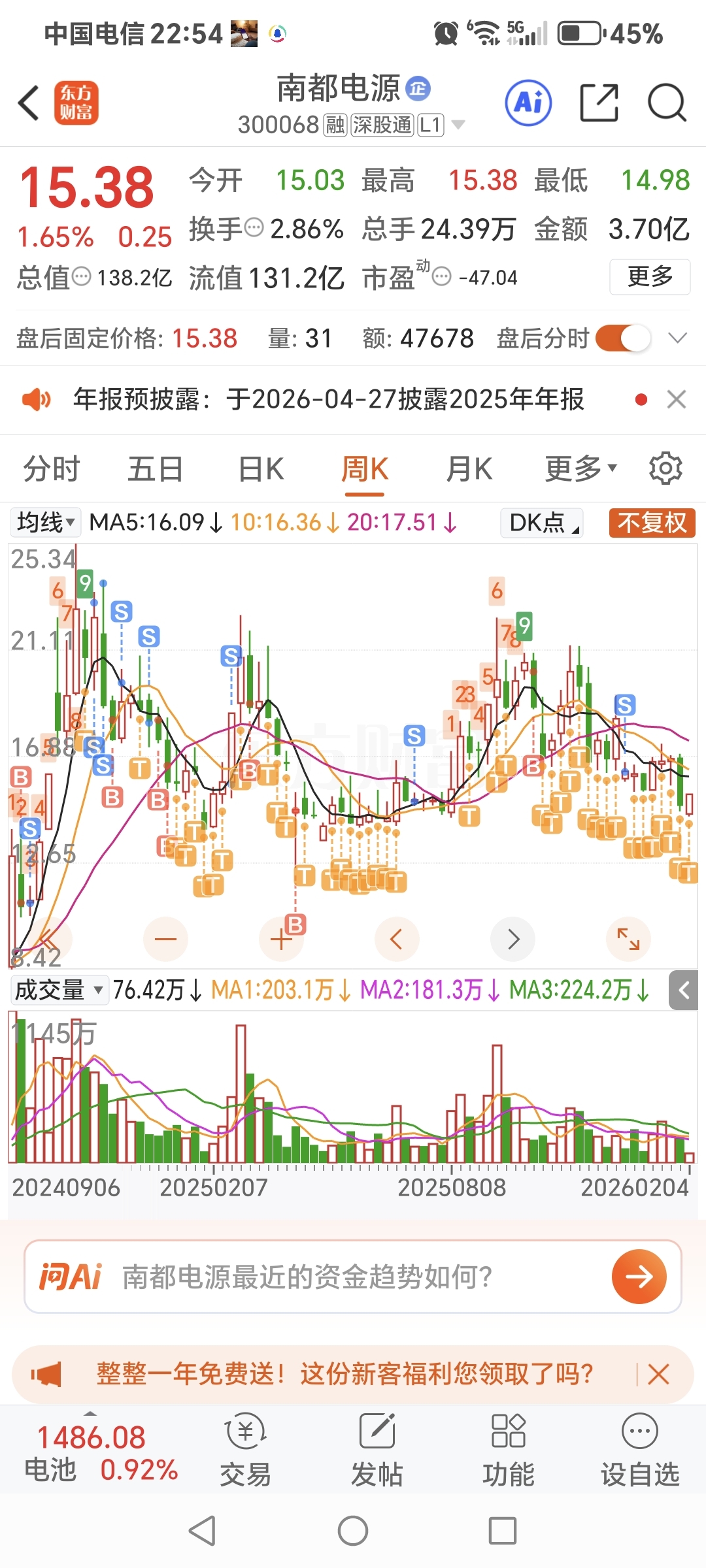 $南都电源(SZ300068)$ 这走势跟去年预报业绩有点相似,不知这次能不能破22