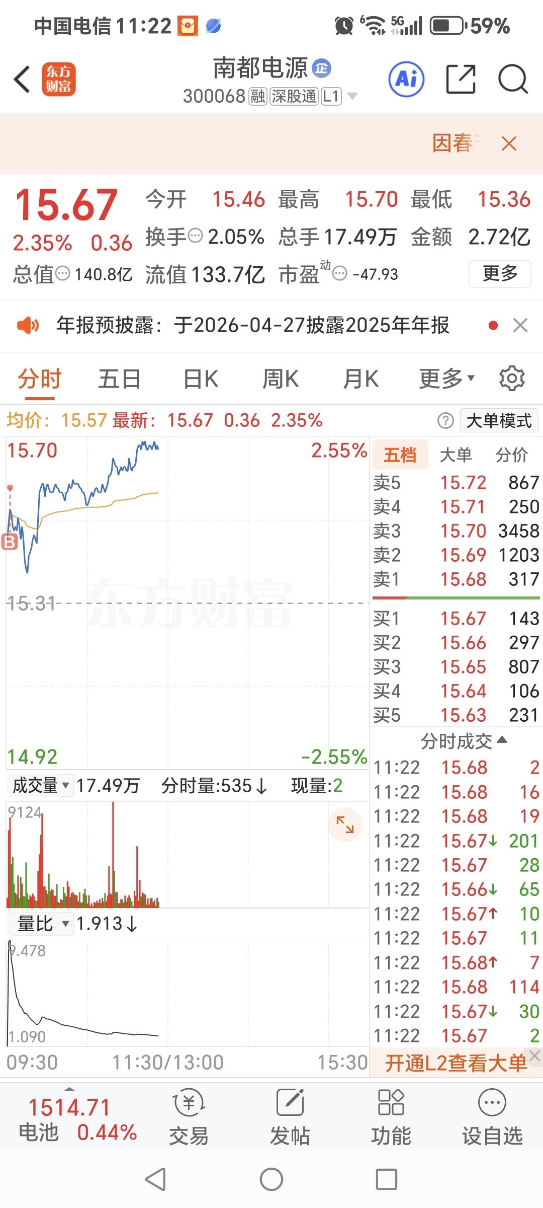 $南都电源(SZ300068)$ 别人不停减仓过年,反正我就每天准时加仓,,14的南都从没怕过,就是送钱