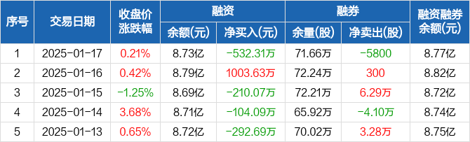 碧水源:融资净偿还532.31万元,融资余额8.73亿元(01-17)