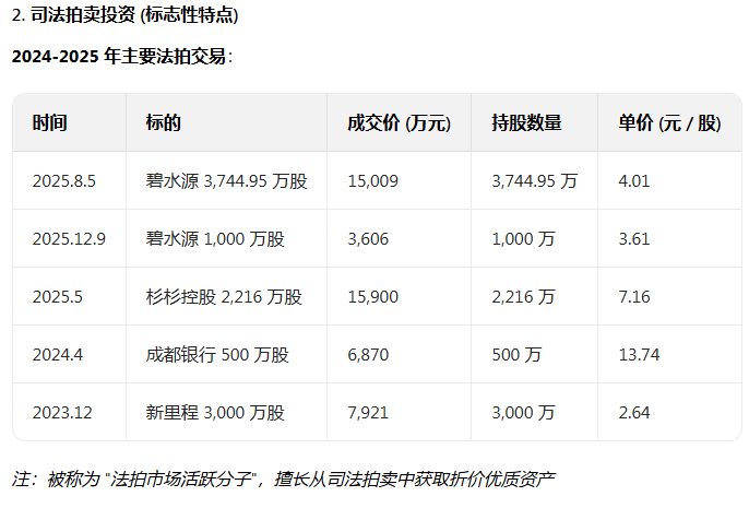 $碧水源(SZ300070)$ 钟革是 A 股知名 "牛散",从 400 元起步,通过 30 年投资积累,总资产达 30 亿元,擅长法拍投资和价值成长股挖掘,目前主要布局半导体、新能源等战略新兴产业。其投资特点是稳健与激进并存,以长期价值投资为主,同时善于把握司法拍卖等特殊机会获取折价资产。