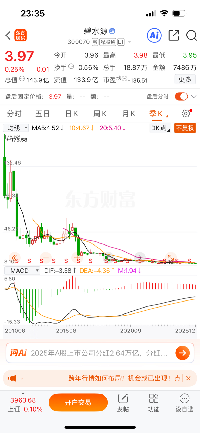 $碧水源(SZ300070)$ 牛市走的还不如之前熊市的时候强!还以为牛市碧水源能回到25元!结果每股净资产7.5元都到不了!到不了也就算了!结果7.5的价格基础上还打了52折!!!!#股市怎么看# 不复权最高到达过175.58元!选对人选对股太重要了!