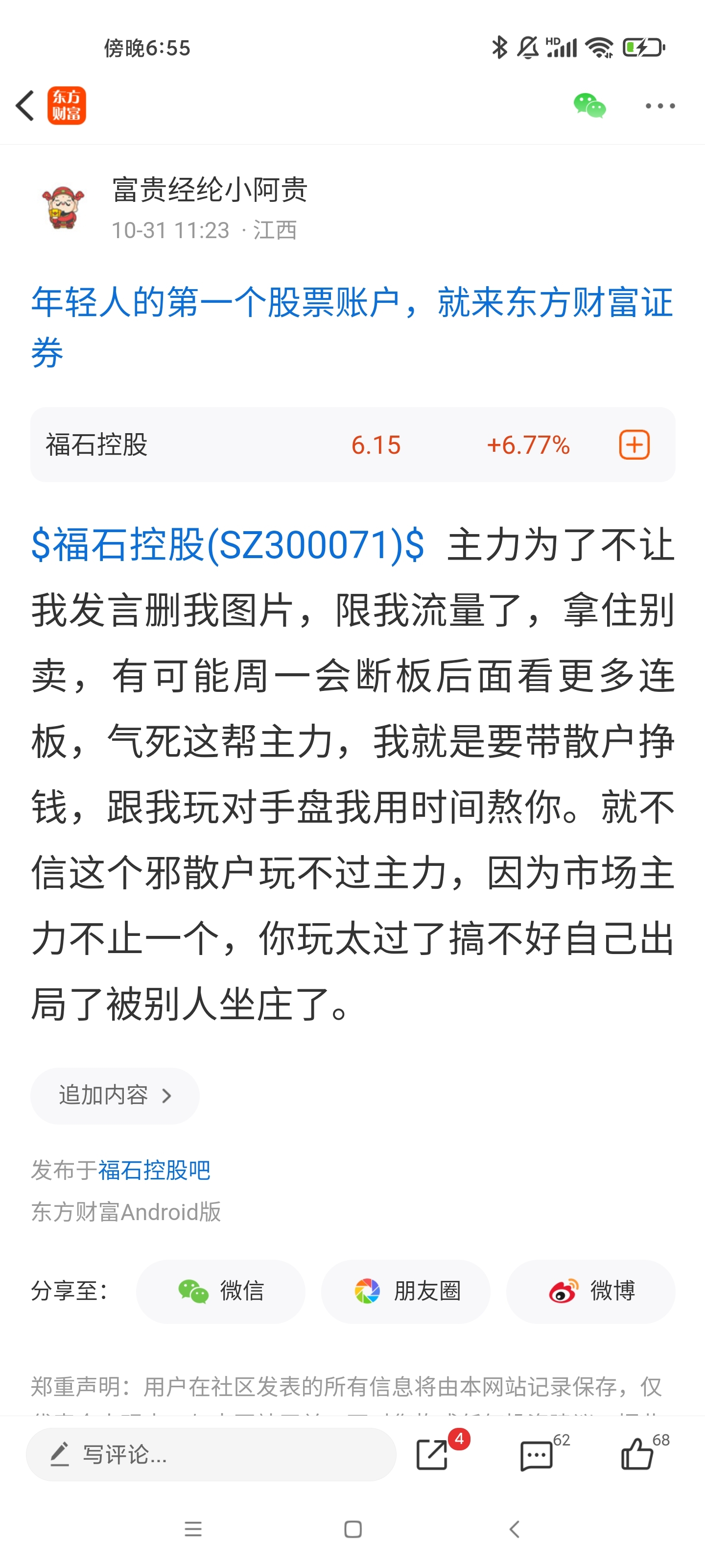 温馨提示: 1.根据《证券法》规定,禁止编造、传播虚假信息或者误导性信息,扰乱证券市场;2.用户在本社区发表的所有资料、言论等仅代表个人观点,与本网站立场无关,不对您构成任何投资建议。用户应基于自己的独立判断,自行决定证券投资并承担相应风险。《东方财富社区管理规定》