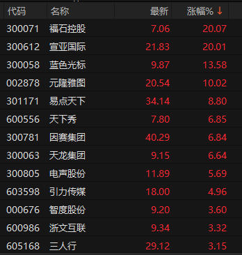 AI应用端近期持续升温,广告营销、软件开发、文化出版等方向涨幅居前。早盘,申万广告营销指数大涨4.78%,福石控股、宣亚国际收获20%幅度涨停;数字媒体指数上涨3.93%,值得买、视觉中国涨停。