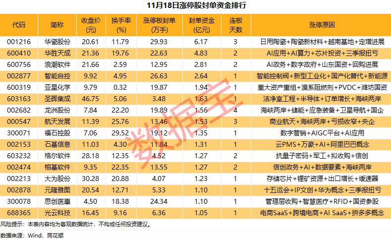 据证券时报·数据宝统计,今日(11月18日),从收盘涨停板封单量来看,华瓷股份、智能自控、华夏幸福、思创医惠、华胜天成、中央商场排名前六,依次为29.93万手、26.63万手、26.35万手、24.34万手、22.63万手、21.96万手。