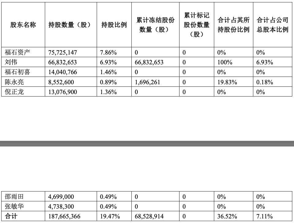 截至公告披露日,陈永亮及其一致行动人所持股份合计累计冻结股数为68,528,914股,合计占其所持股份的36.52%,合计占公司总股本的7.11%。