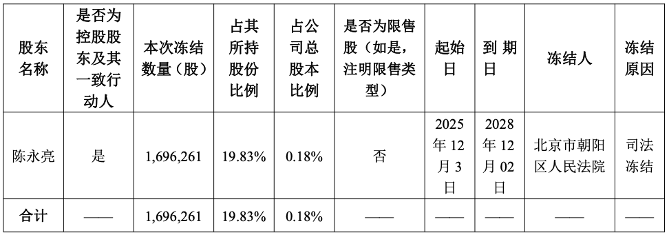 公告显示,陈永亮冻结的股数为1,696,261股,占其所持股份的19.83%,占公司总股本的0.18%。冻结的起始日期为2025年12月3日,预计到期日为2028年12月2日,冻结原因为司法冻结,由北京市朝阳区人民法院实施。