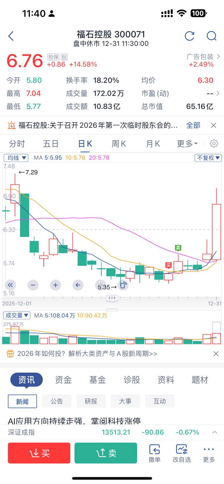 $福石控股(SZ300071)$ 我就是个,拿着好票赚几个点就出了
