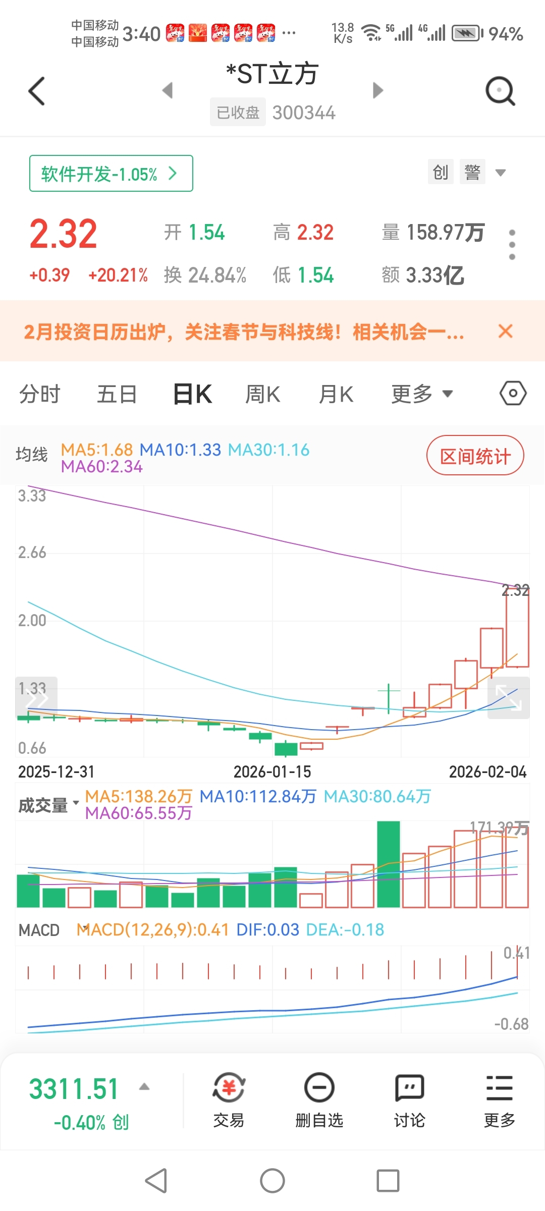 还是ST立方牛啊,今天跌停开盘,涨二十个点,来回就四十个点。