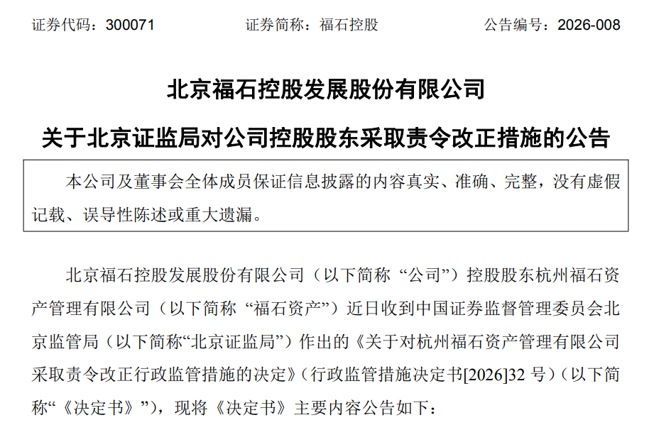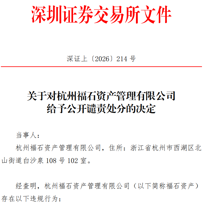 2月13日,深交所官网发布对杭州福石资产管理有限公司(以下简称福石资产)给予公开谴责处分的决定。当日,福石控股(300071)也发布了北京证监局对公司控股股东福石资产采取责令改正措施的公告。