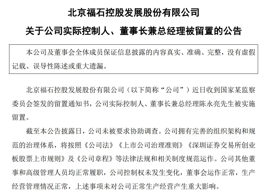 读创财经注意到,2月1日晚间,福石控股(300071)公告称,近日收到国家某监察委员会签发的留置通知书,公司实际控制人、董事长兼总经理陈永亮被实施留置。