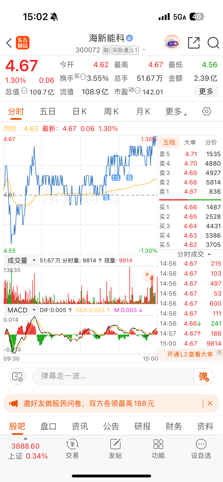 $海新能科(SZ300072)$ 卓越新能走出了我今天对海新的预期走势,可惜海新下午虽然活跃了一些,但是没能突破这几天的高度,成交量也是。所以还是决定撤出昨天的加仓