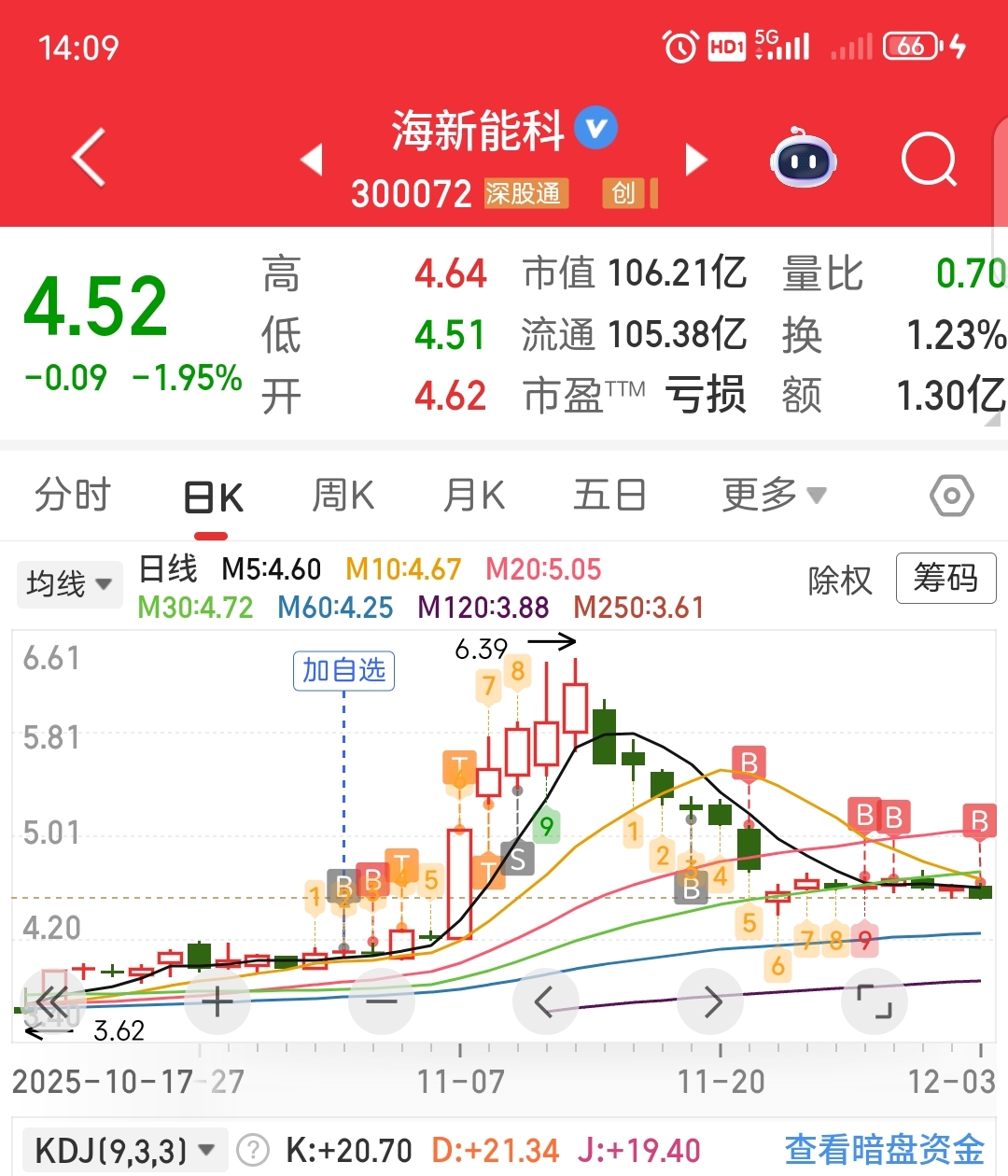 $海新能科(SZ300072)$ 4.52继续少量回补仓位