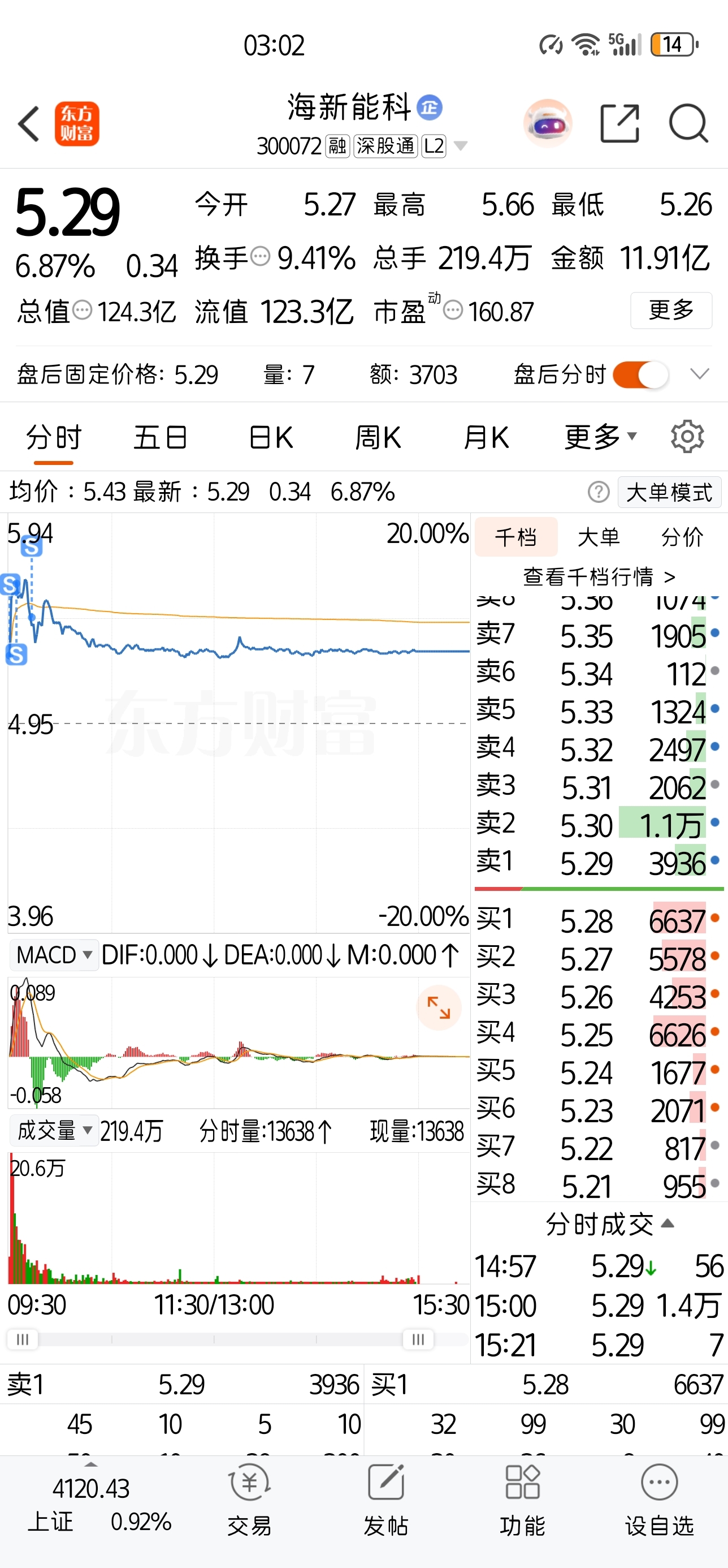 $海新能科(SZ300072)$ 一个石化机械一个你埋伏了4天 咱不想再接了就静静的看着你俩咋表演