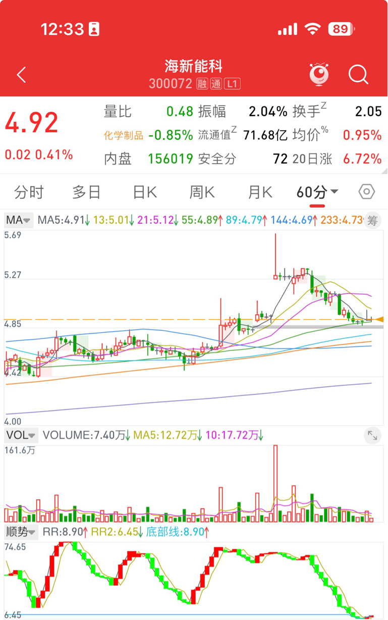 $海新能科(SZ300072)$ 60分钟指标出现机会了,昨天买的没走,继续等