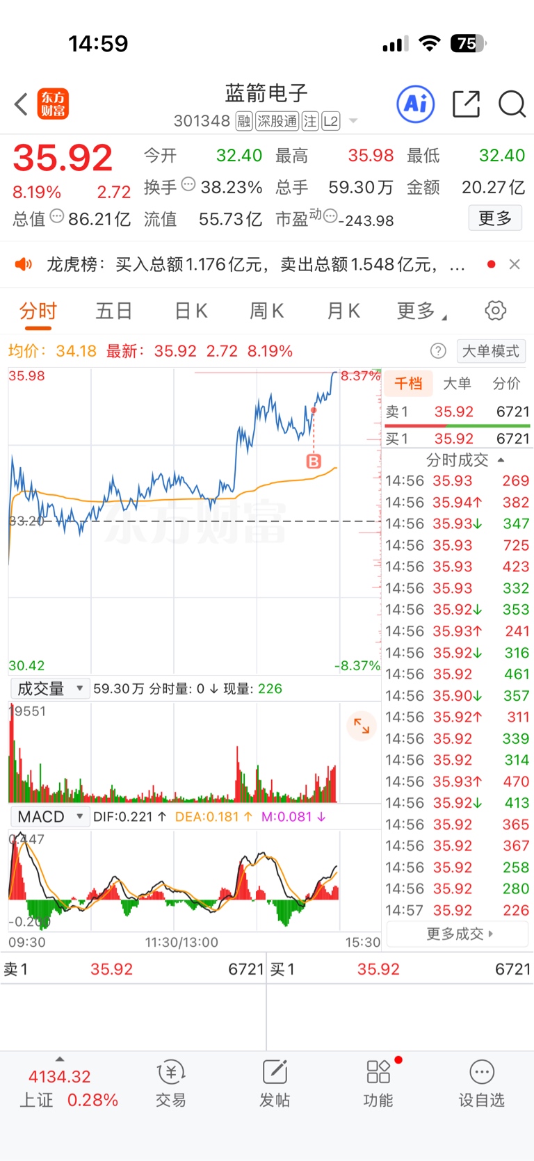 今天没放量,先出来了,下周还是有肉吃的。换了强势的蓝箭。相信人与股票之间有一定缘,让你赚钱的票卖了之后还会给机会你进且赚钱,让你亏钱的票就是没缘,要拉黑。