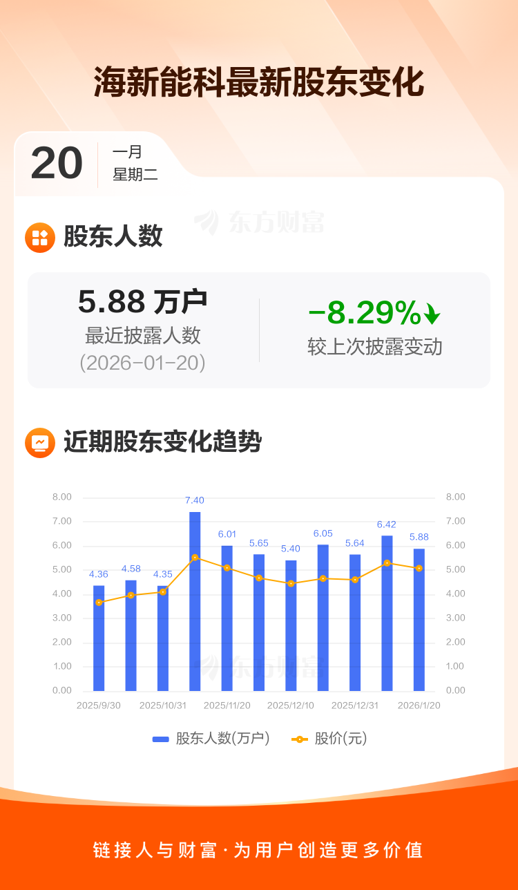 海新能科最新披露数据显示,截至1月20日公司股东户数为5.88万户,较上期(2026年1月9日)减少5319户,降幅为8.29%。户均持有流通股数量由上期的3.63万股上升至3.96万股,户均持股金额由上期的19.22万元增加至20.09万元。