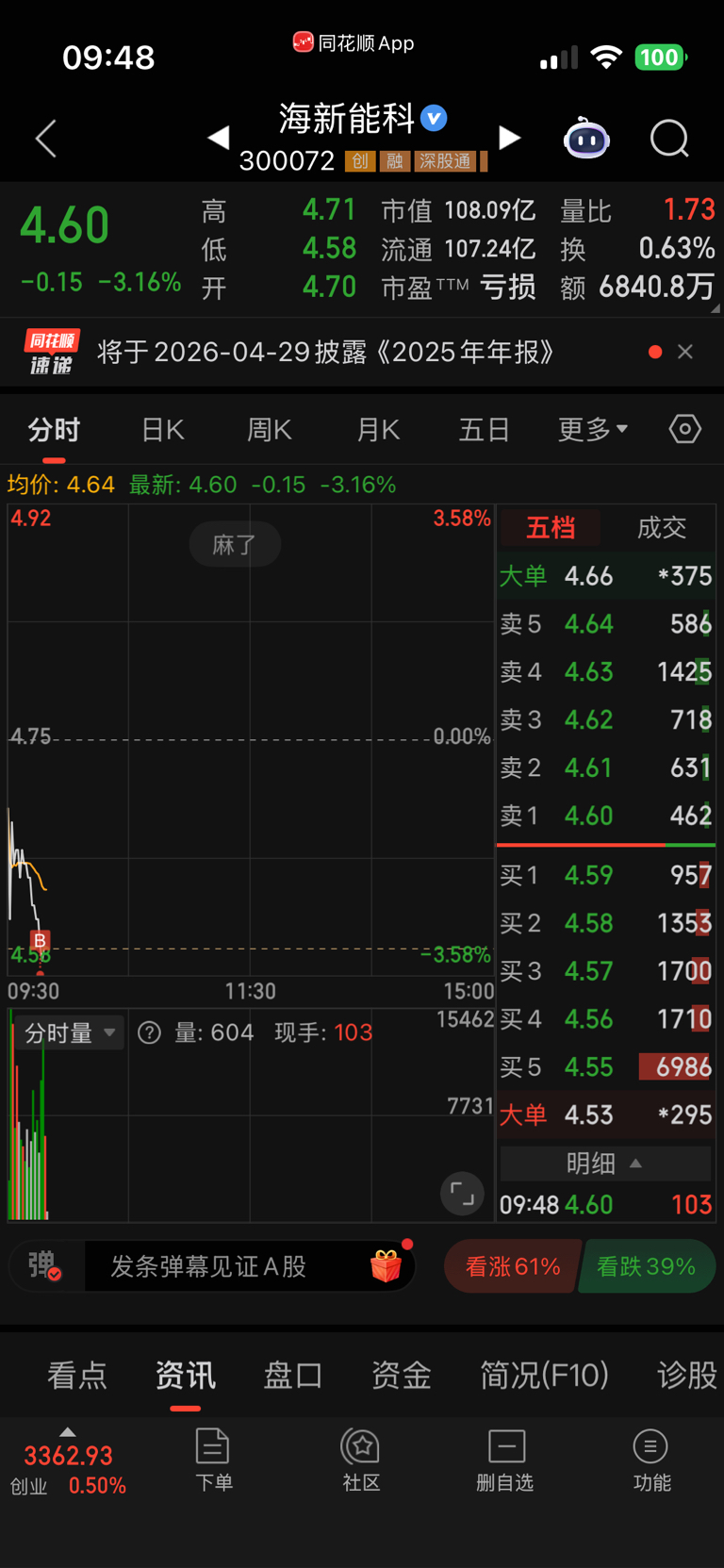 $海新能科(SZ300072)$ 感谢主力赏筹码,4.58收了点,还会有更低吗?看来年前主力不会发奖金了